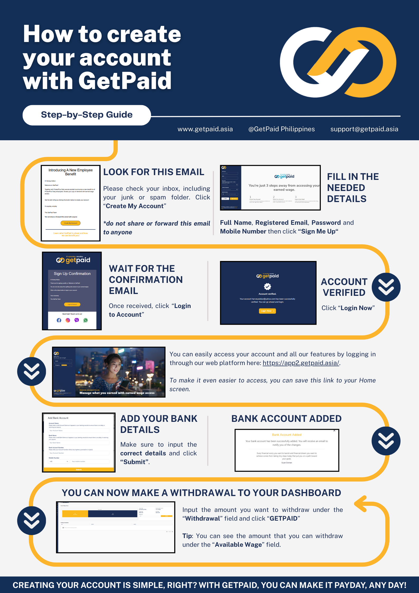 The Account Creation process starts with your company / HR department. Once you have been added into the program, follow these steps to create your GetPaid account: